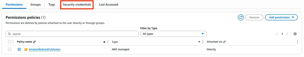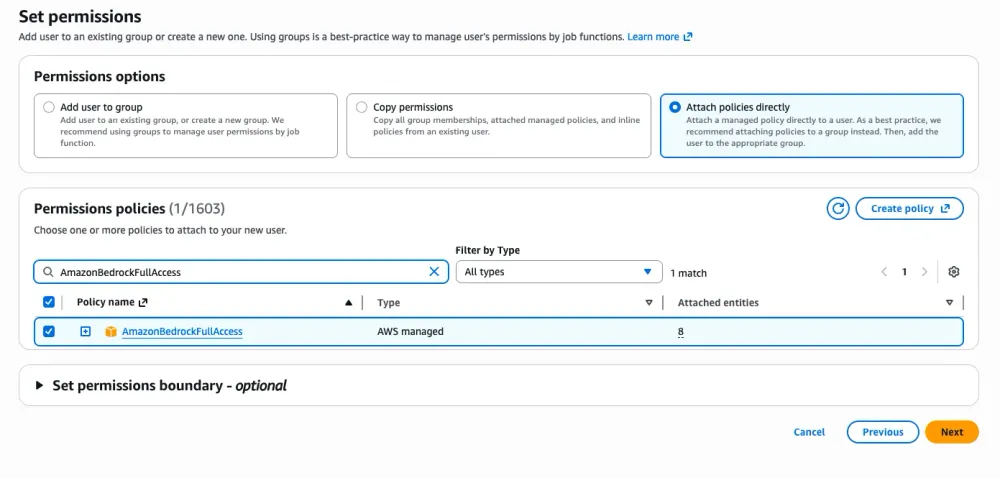 From the list of permission policies, select AmazonBedrockFullAccess