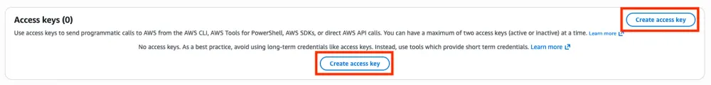 Scroll down to the Access keys section and click Create access key