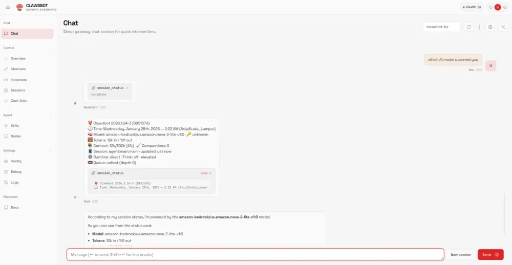 Your Molt Bot is now running locally, powered by Amazon Nova 2 Lite on Amazon Bedrock.